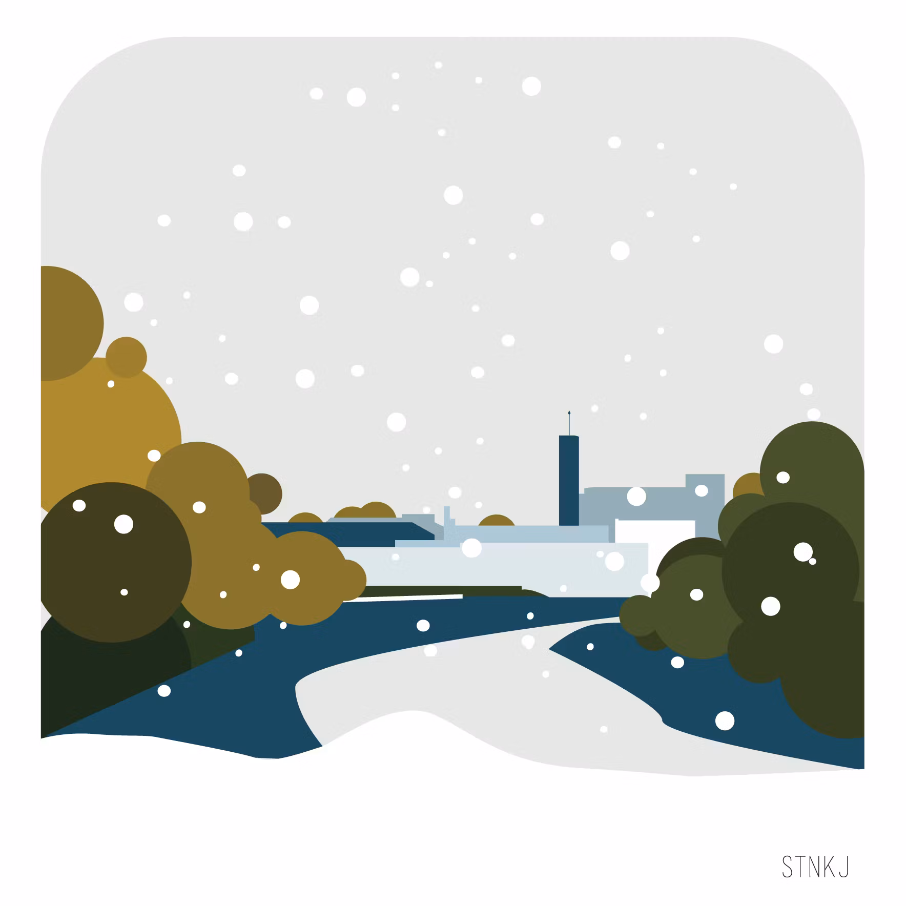 Tre stykk julekort av Steinkjerelva i 15x15cm selges i pakke. Kortene selges uten konvolutter.
