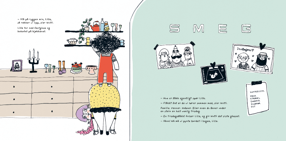 Noen er store, noen er små. Og det trenger ikke bare være felles gener som binder en familie sammen. Maria Myhr Haugnes’ bok «Flåkkfesten» er en lun og morsom bok for de minste, en feiring av den mangfoldige familieflokken og sprø bestemødre. Visuelt flott er den også. Jeg synes det er en søt liten perle av en bok.